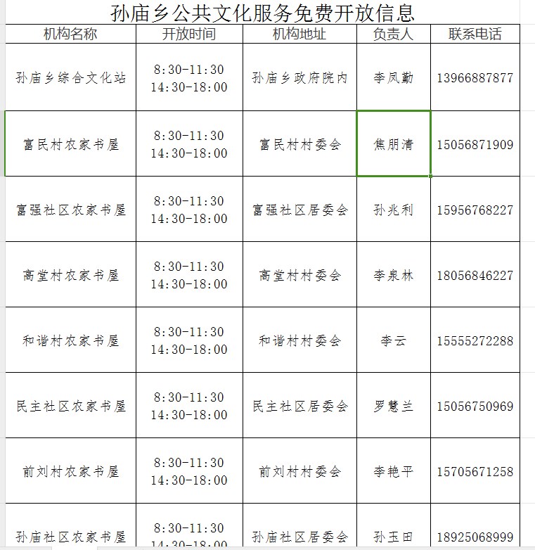 【公共服务】孙庙乡公共文化机构免费开放信息