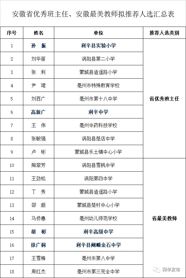 根据《安徽省教育厅关于组织开展安徽省中小学十佳班主任、优秀班主任和第四届安徽最美教师推选活动的通知》(皖教秘师〔2023〕47号)要求,经学校推荐、县区初选、市级评选,拟推荐利辛县实验小学孙振等9名教师为安徽省中小学优秀班主任人选;拟推荐涡阳县雪枫中学陶翠芳等9名教师为安徽最美教师人选,现予以公示(详见附件)。