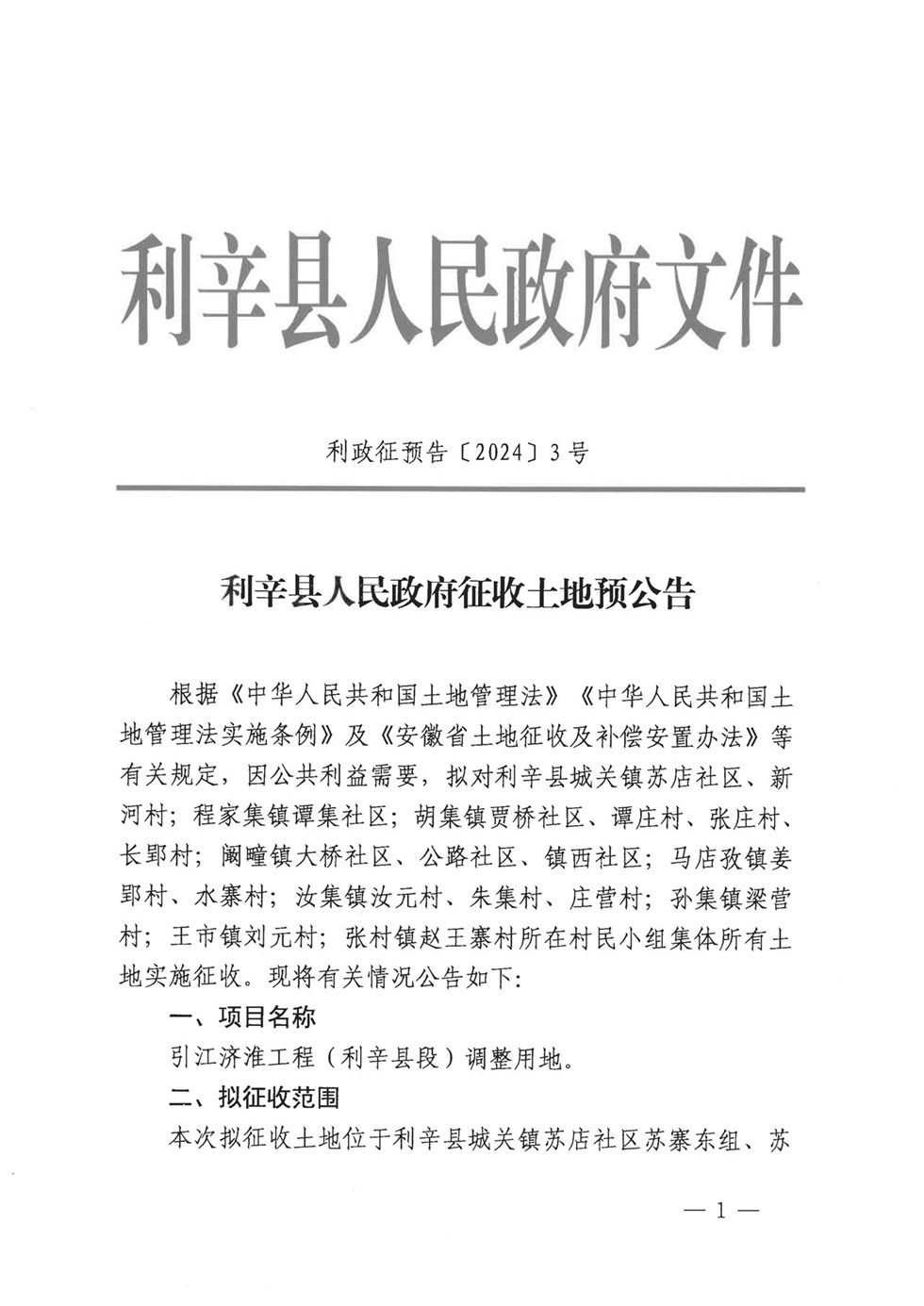 [征收土地公告] 利辛县人民政府征收土地预公告 利政征预告〔2024〕3号(含汝集镇)