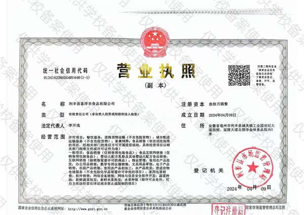 (1) 2024年孙庙乡农村义务教育学生营养改善计划的供餐企业:利辛县喜洋洋食品有限公司,统一社会信用代码:91341623MADG4RU448,地址:安徽省亳州市利辛县城关镇工业园世纪大道西侧、延陵大道北侧华金味食品院内5米。