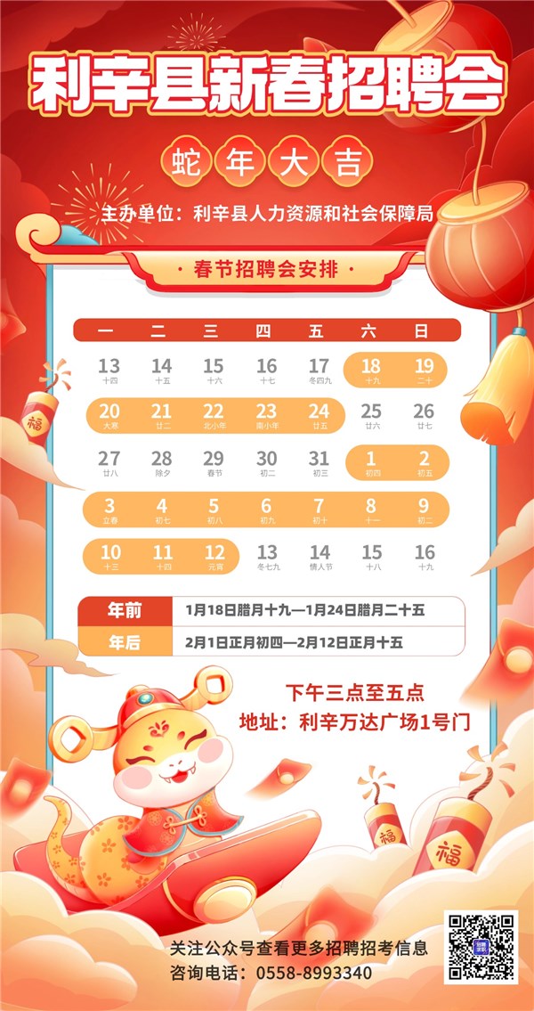 时间:年前1月18日(腊月十九)至1月24日(腊月二十五);年后2月1日(正月初四)至2月12日(正月十五)每天下午3-5点
