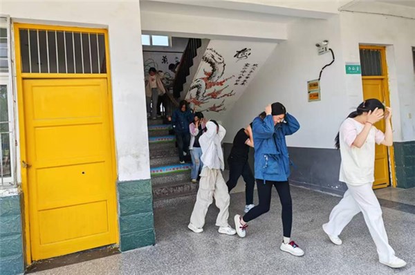 随着警报声响起,地震演练正式开始。同学们迅速反应,按照课堂所学,双手抱头、蜷缩身体,躲在课桌下或墙角等坚固三角区。短暂的避险后,第二次警报声传来,在工作人员的指挥下,同学们双手护住头部、弯腰低姿,沿着预定的路线快速有序撤离。