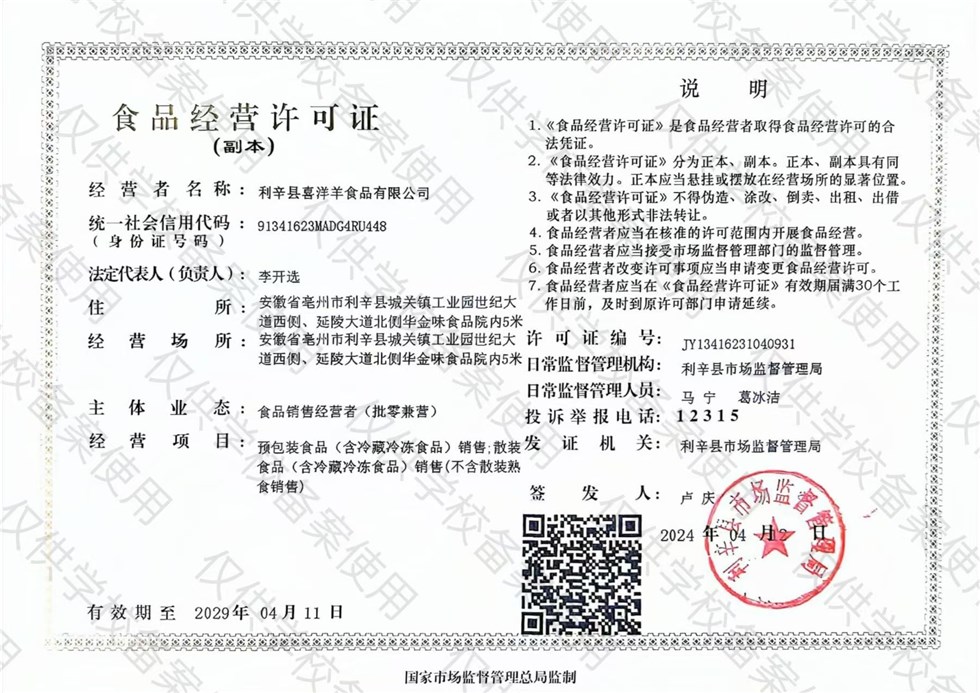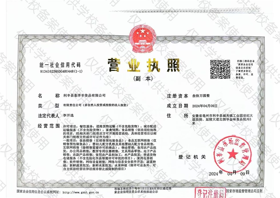 (1) 2024年孙庙乡农村义务教育学生营养改善计划的供餐企业:利辛县喜洋洋食品有限公司,统一社会信用代码:91341623MADG4RU448,地址:安徽省亳州市利辛县城关镇工业园世纪大道西侧、延陵大道北侧华金味食品院内5米。