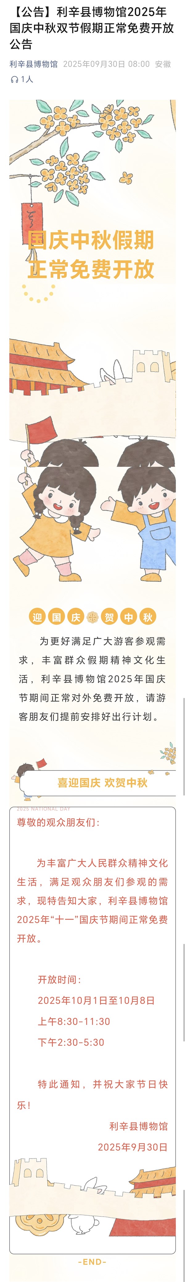 利辛县博物馆2025年国庆中秋双节假期正常免费开放公告