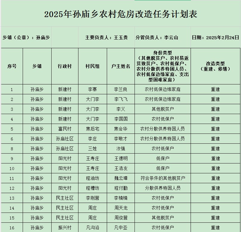 利辛县孙庙乡2025年危房改造任务分配