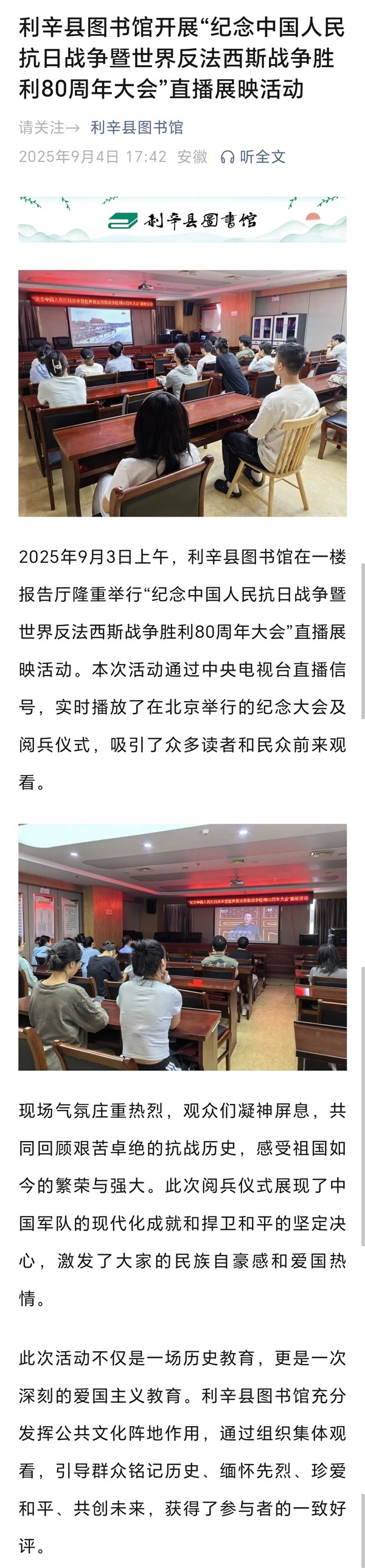 【活动开展情况】利辛县图书馆开展“纪念中国人民抗日战争暨世界反法西斯战争胜利80周年大会”直播展映活动