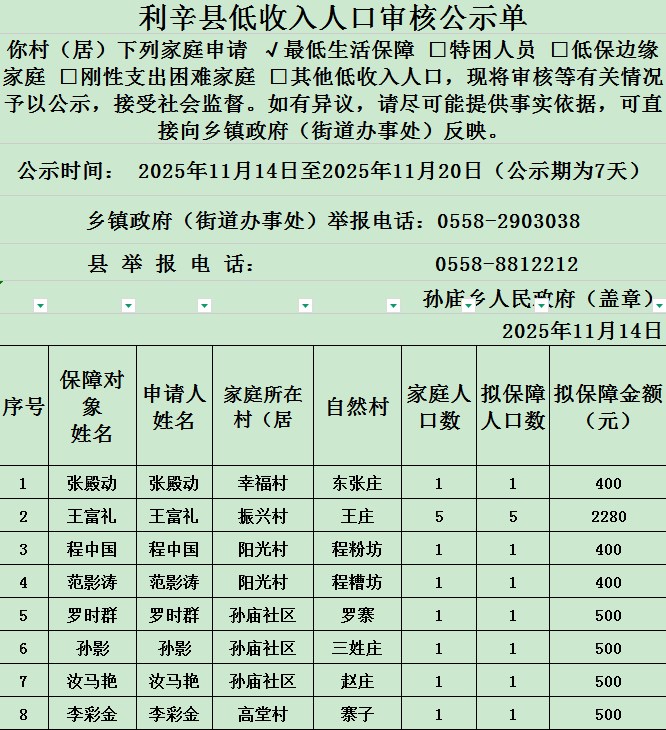 孙庙乡2025年11月农村低保每月新增公示