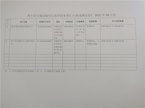 利辛县交通运输局行政审批事项汇总表(道路运政) 2025年08月份