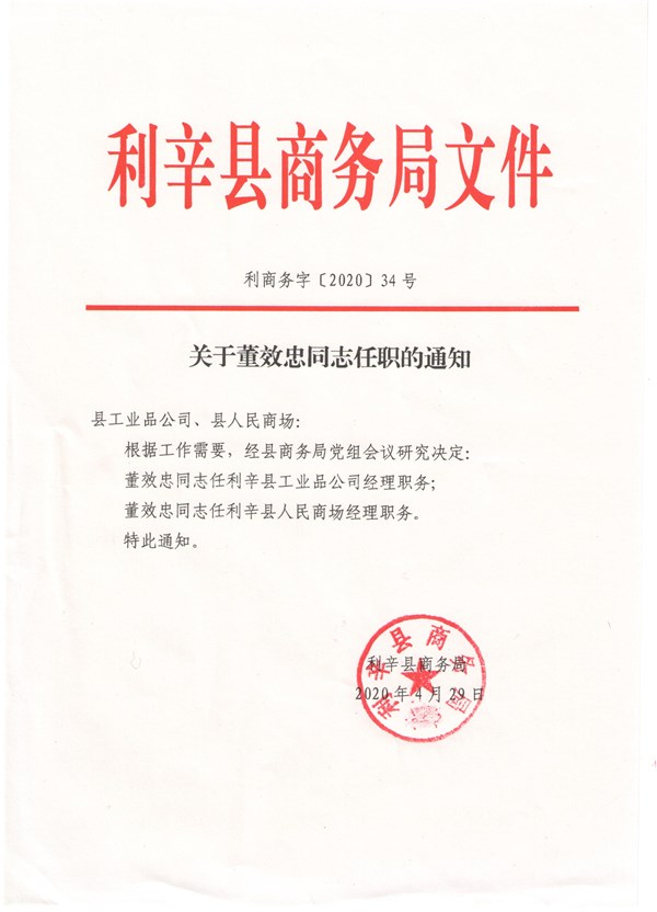| 名称: | 关于董效忠同志任职的通知 | ||