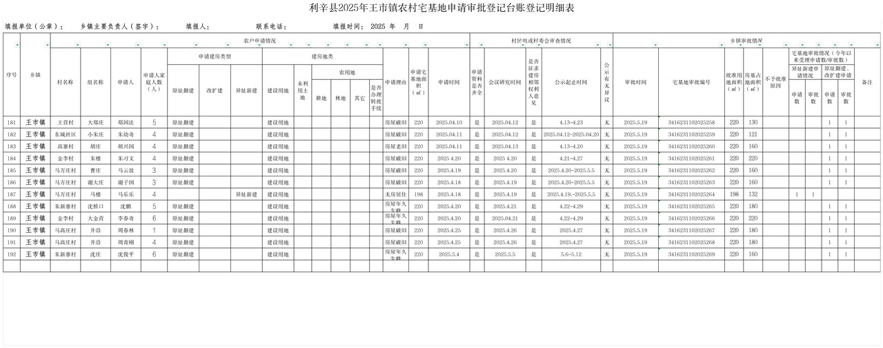 | 名称: | 王市镇2025年度农村宅基地审批登记台账登记明细表(2025.05.28) | 文号: | 无 |