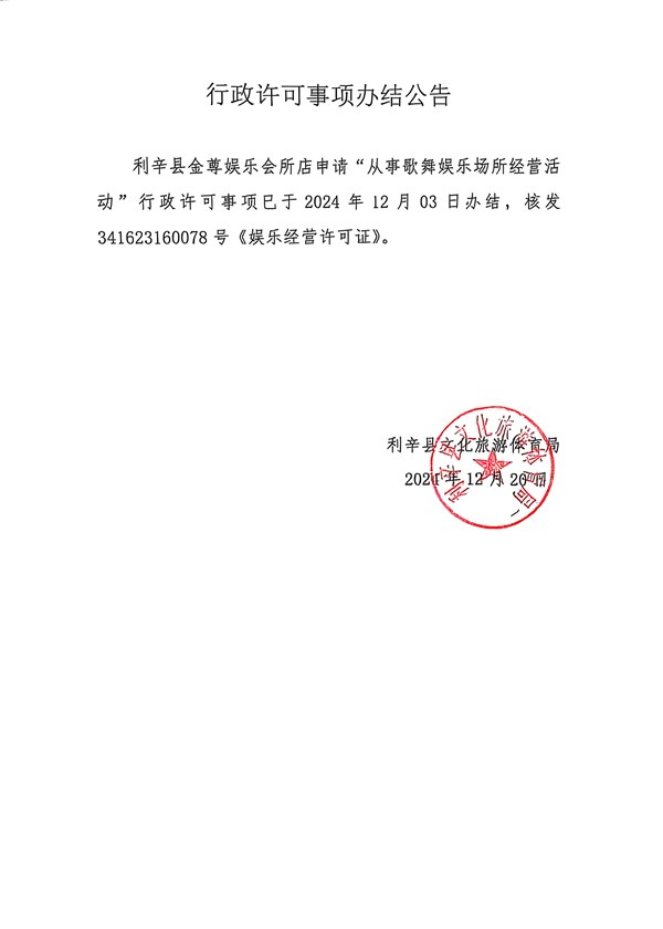 | 名称: | 利辛县金尊娱乐会所店申请歌舞娱乐场所经营活动行政许可办结公告 |