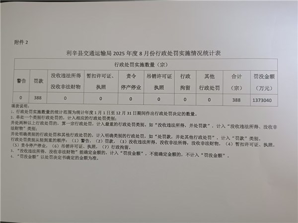 | 名称: | 利辛县交通运输局2025年度8月份行政处罚实施情况统计表 |