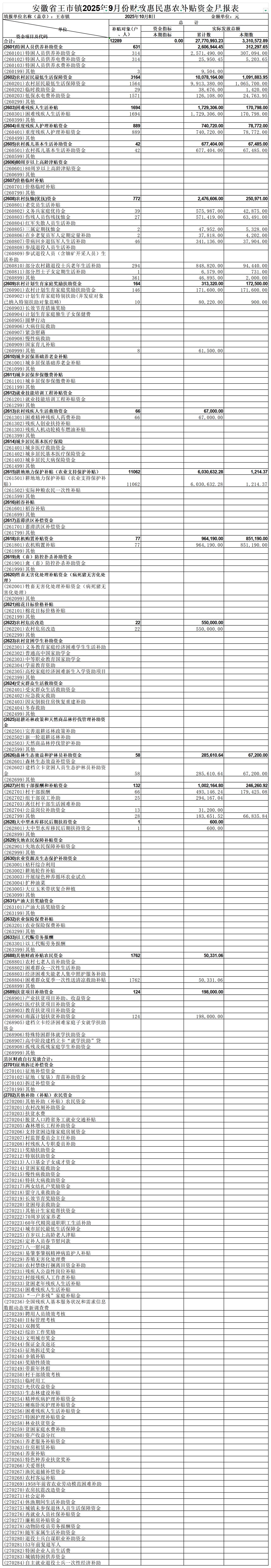 | 名称: | 王市镇2025年9月份财政惠民惠农补贴资金月报表 | 文号: | 无 |