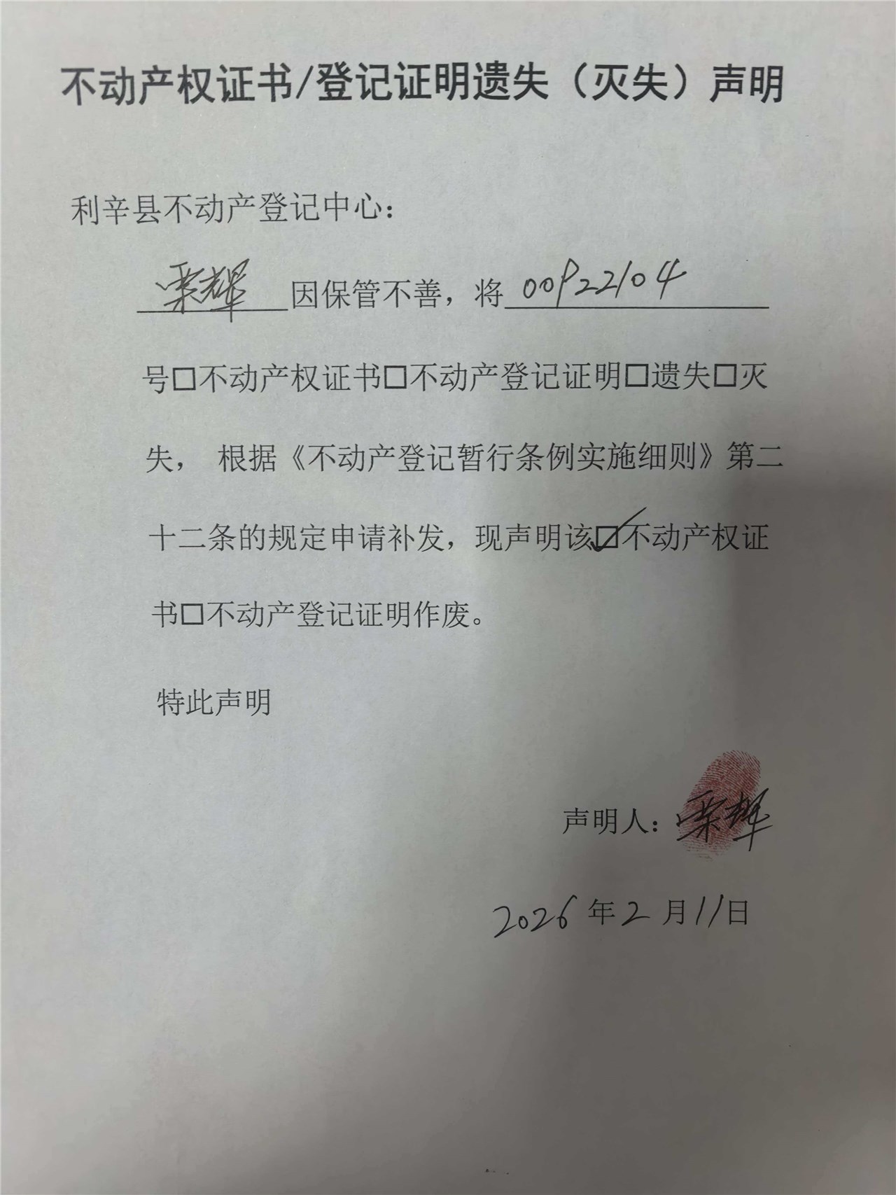 | 名称: | 遗失声明利辛县不动产权第00922104号) |