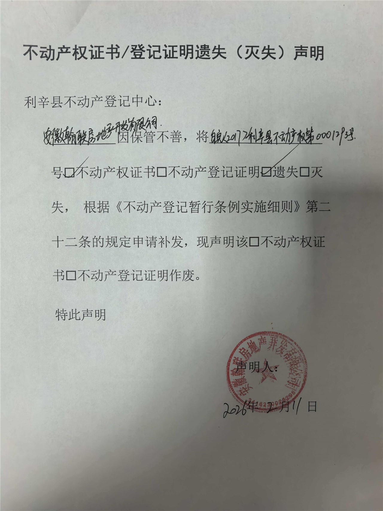| 名称: | 遗失声明(皖(2017)利辛县不动产权第0001293号) |