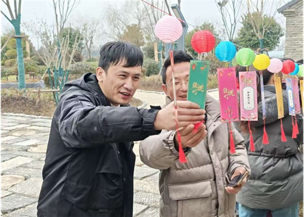 与此同时,灯谜区也热闹非凡。一条条灯谜悬挂在灯笼下随风轻摆,内容涵盖历史文化、民俗风情、生活常识等,兼具趣味性与知识性。村民们穿梭在灯谜间,或独自思考,或三五成群热烈讨论,现场不时传来阵阵欢声笑语。