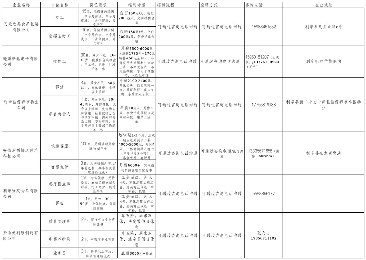 利辛县部分企业用工需求,涉及车间普工、操作工、客服、保洁等