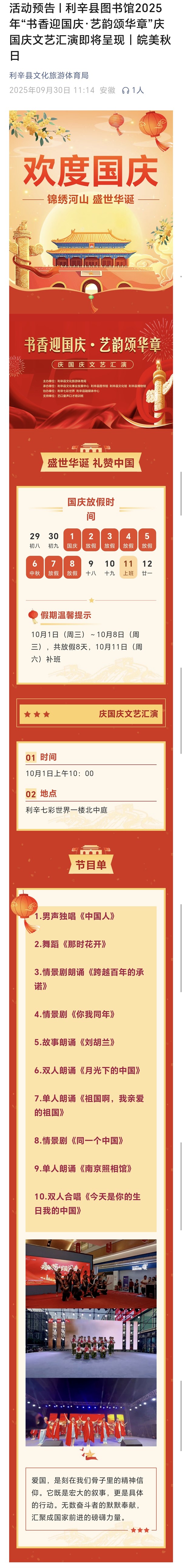 【文明旅游宣传信息】 利辛县图书馆2025年“书香迎国庆·艺韵颂华章”庆国庆文艺汇演即将呈现