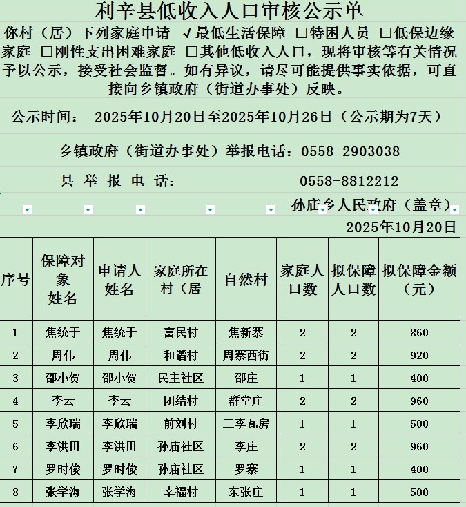 孙庙乡2025年10月农村低保每月新增公示