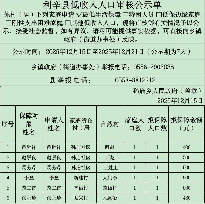 孙庙乡农村低保每月新增公示.xlsx 【11.91 KB】