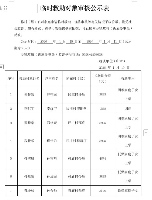 孙庙乡2026年1月临时救助公示