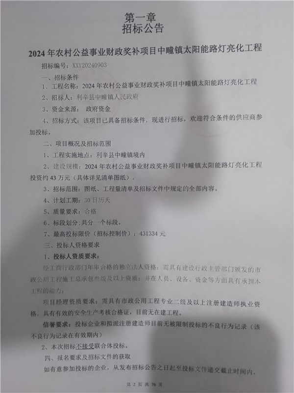 | 名称: | 2024年农村公益事业财政奖补项目中疃镇太阳能路灯亮化工程招标公告 |
