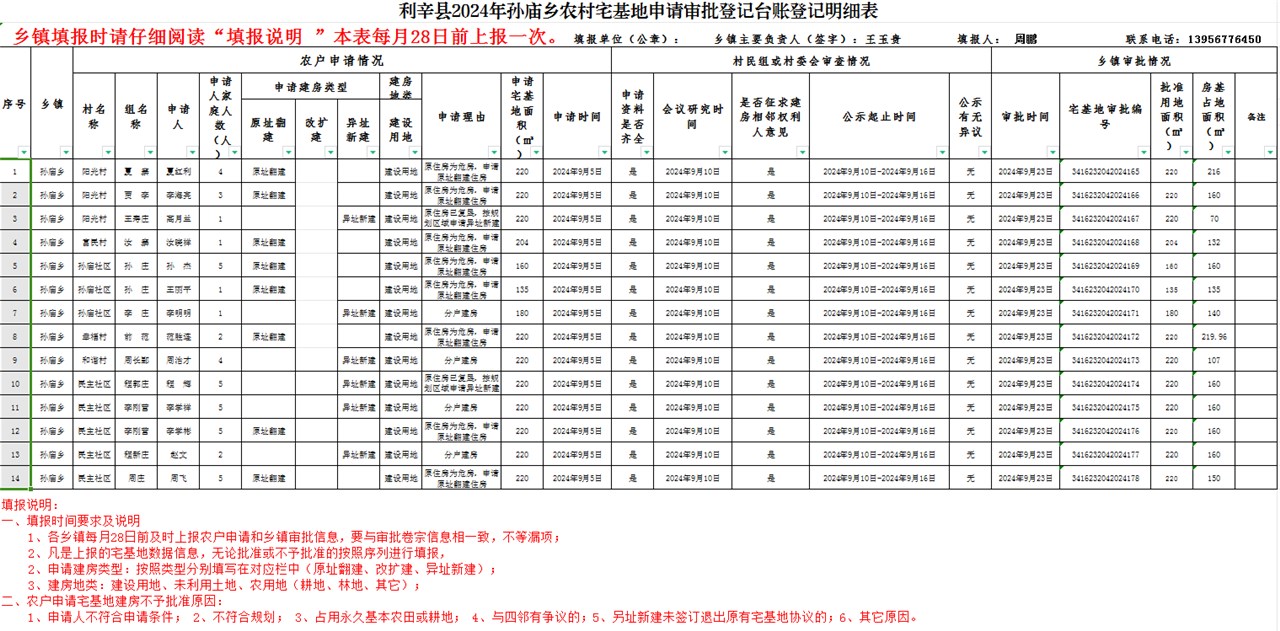 | 名称: | 利辛县孙庙乡2024年9月份农村宅基地申请审批登记台账登记明细表 |