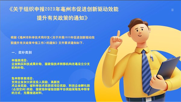 | 名称: | 一图读懂:《关于组织申报2023年亳州市促进创新驱动 效能提升有关政策的通知》 |
