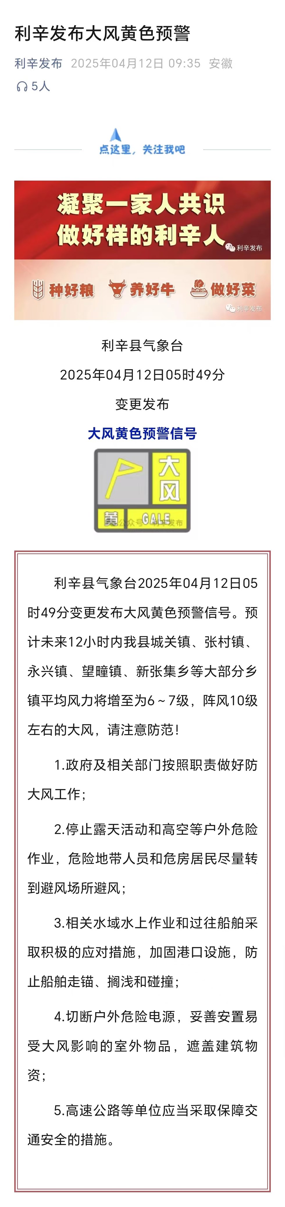 | 名称: | 【天气预警】利辛发布大风黄色预警 |