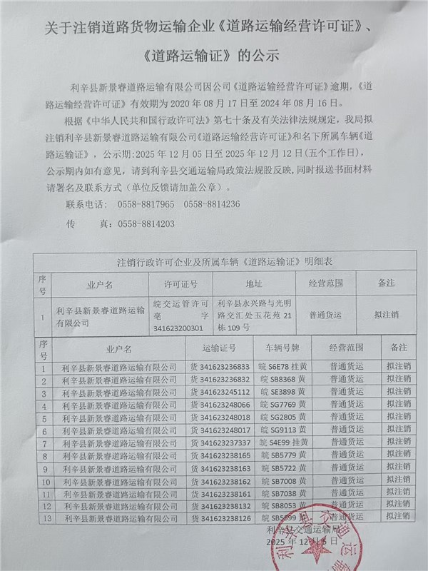 | 名称: | 关于拟注销道路货物运输企业《道路运输经营许可证》《道路运输证》的公示 |