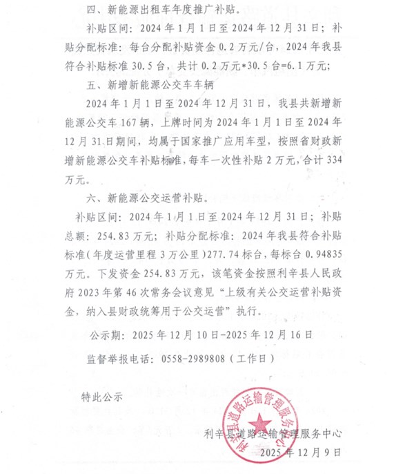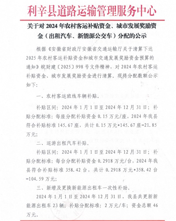 | 名称: | 关于对2024年农村客运补贴资金、城市发展奖励资金(出租汽车、新能源公交车)分配的公示 |