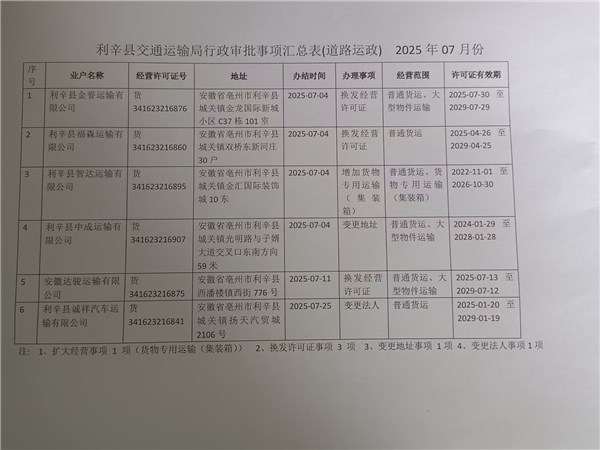 | 名称: | 利辛县交通运输局行政审批事项汇总表(道路运政) 2025年07月份 |