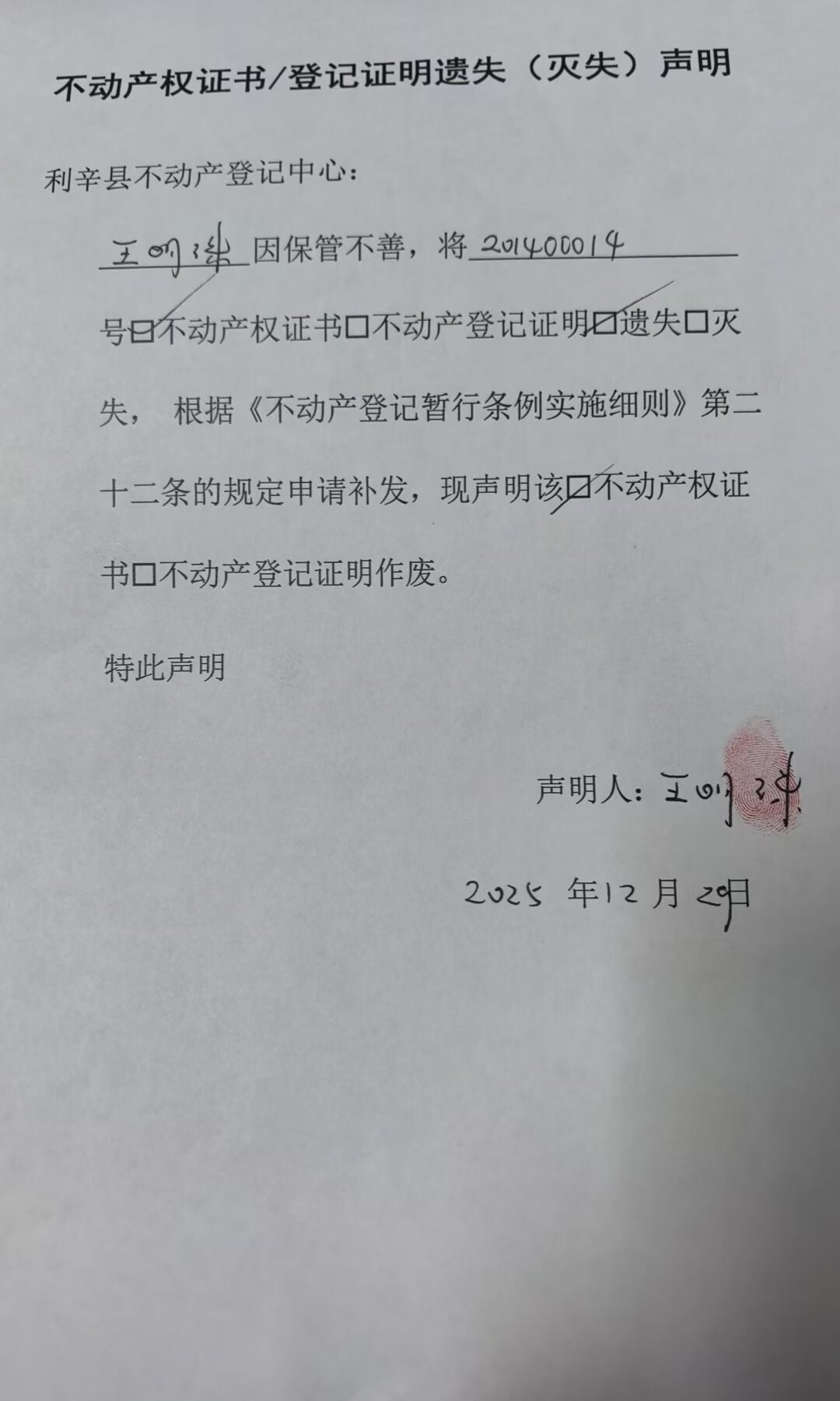 | 名称: | 遗失声明(利辛县不动产权第201400014号) | 文号: | 无 |