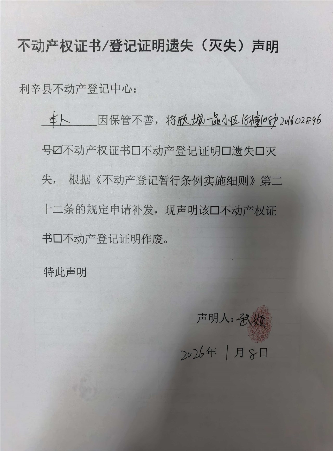 | 名称: | 遗失声明(利辛县不动产权第201602896号) |