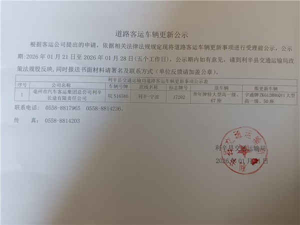 | 名称: | 道路客运班线车辆更新公示(利辛-宁波) |