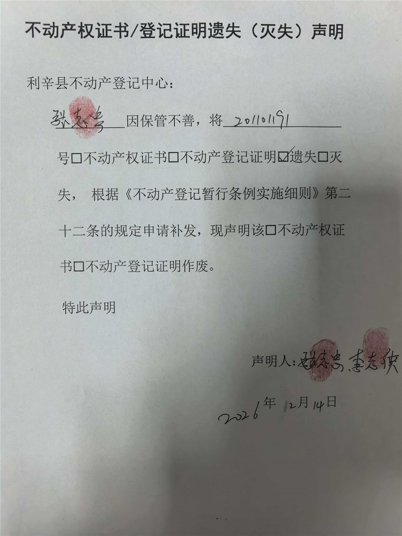 | 名称: | 遗失声明利辛县不动产权第201101191号) |