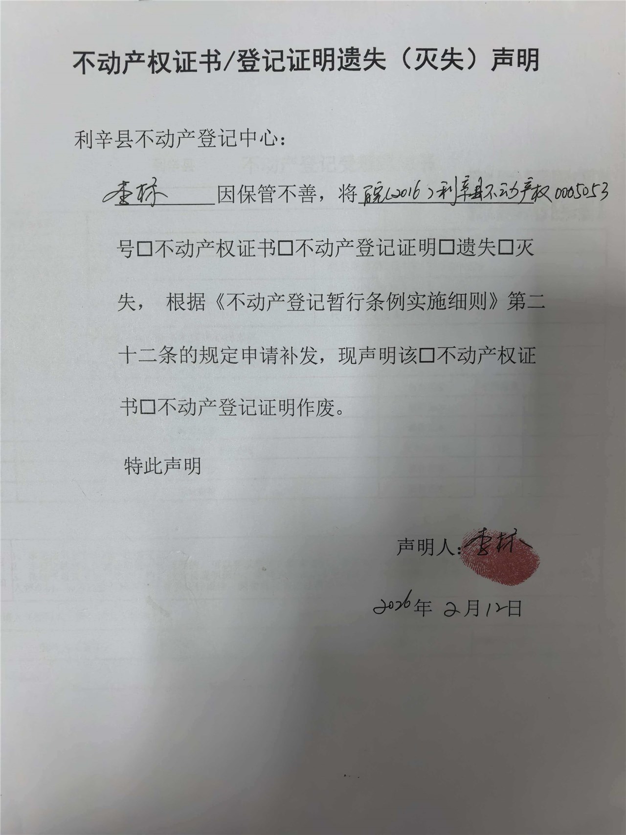 | 名称: | 遗失声明(皖(2023)利辛县不动产权第0005053号) |