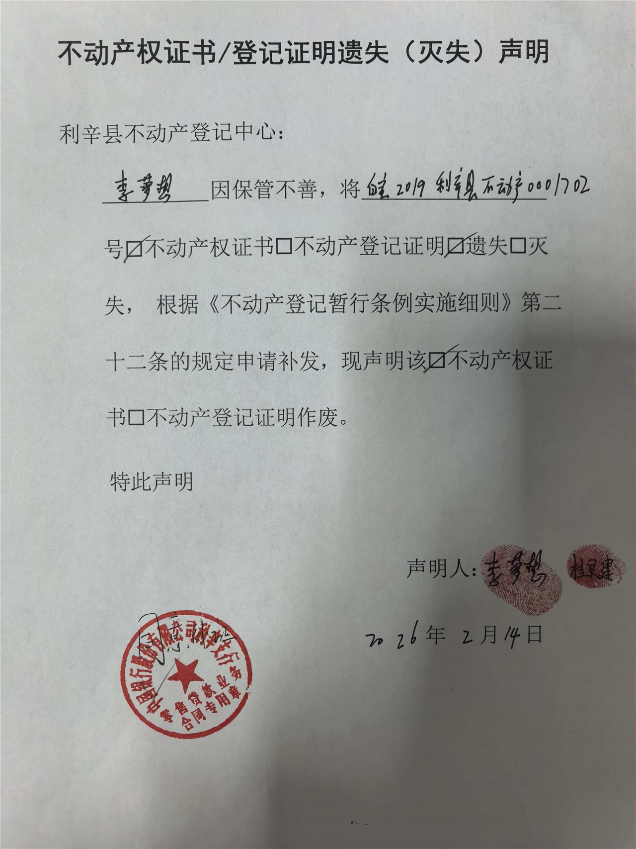 | 名称: | 遗失声明(皖(2019)利辛县不动产权第0001702号) |