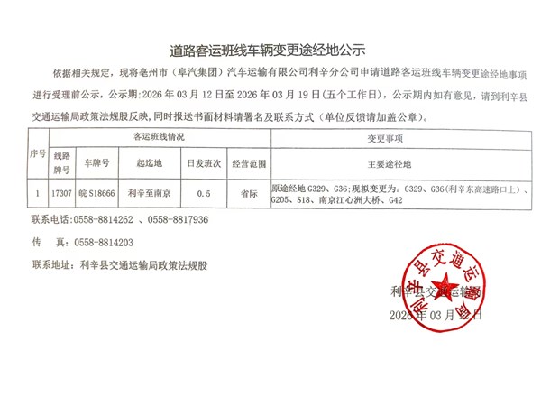 道路客运车辆变更途径地公示