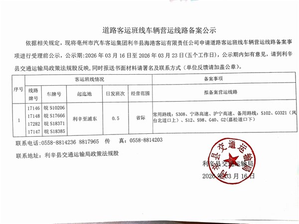 | 名称: | 道路客运班线车辆营运线路备案公示(二) |