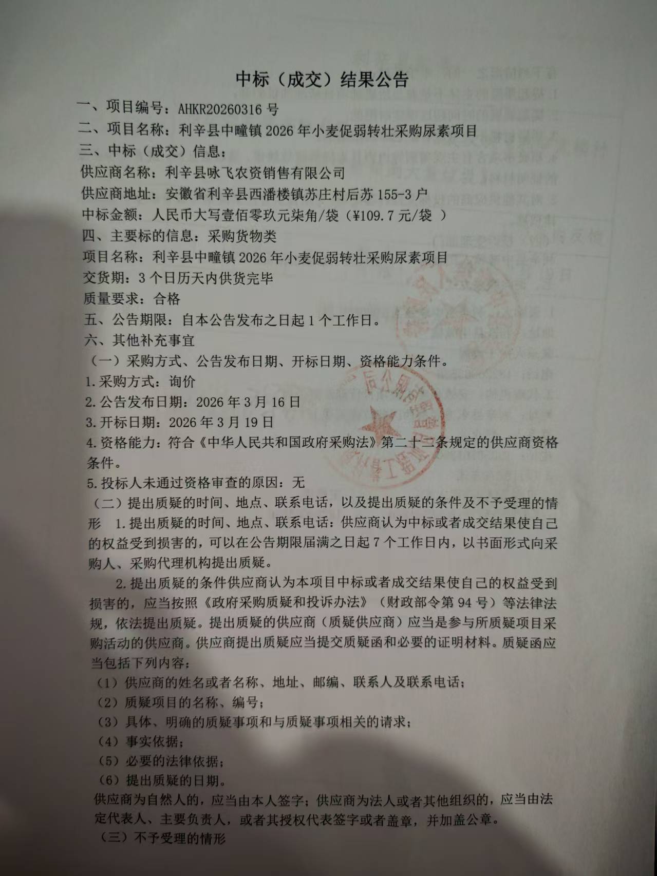 | 名称: | 中标(成交)结果公告——利辛县中疃镇 2026 年小麦促弱转壮采购尿素项目 |