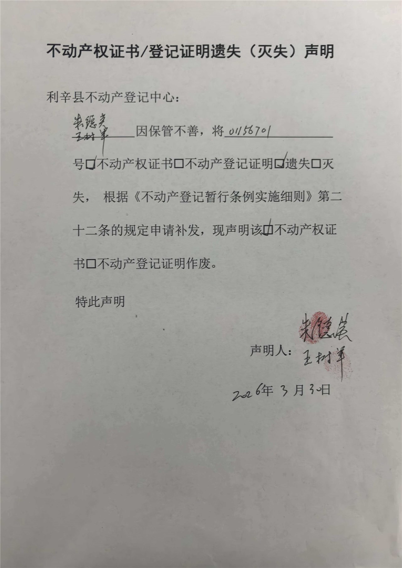 | 名称: | 遗失声明 利辛县不动产权第01156701号 |