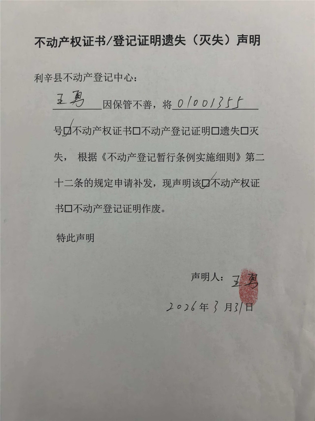 | 名称: | 遗失声明 利辛县不动产权第01001355号 |