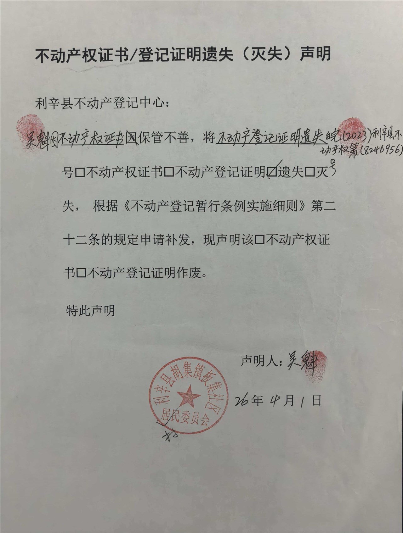 | 名称: | 遗失声明 皖(2023)利辛县不动产权第8246956号 |