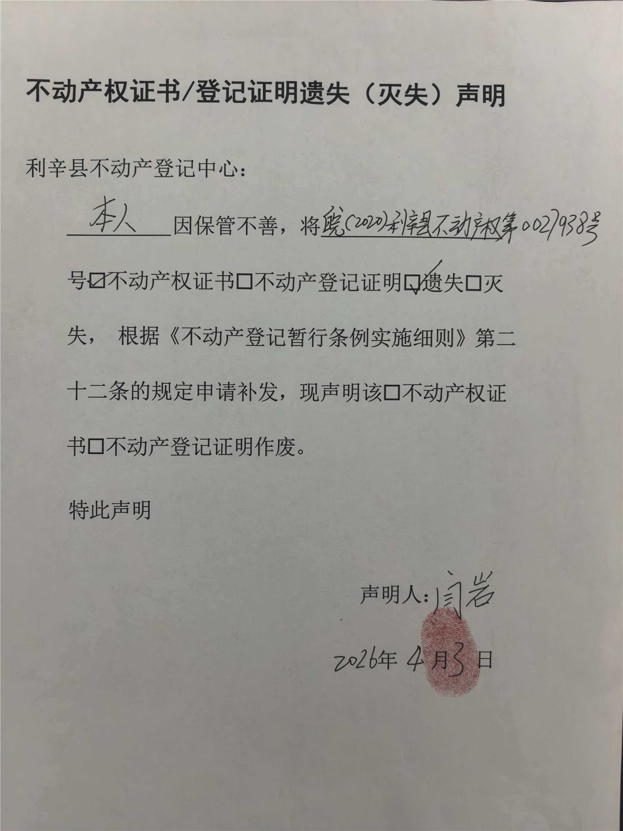 | 名称: | 遗失声明 皖(2020)利辛县不动产权第0027938号 |
